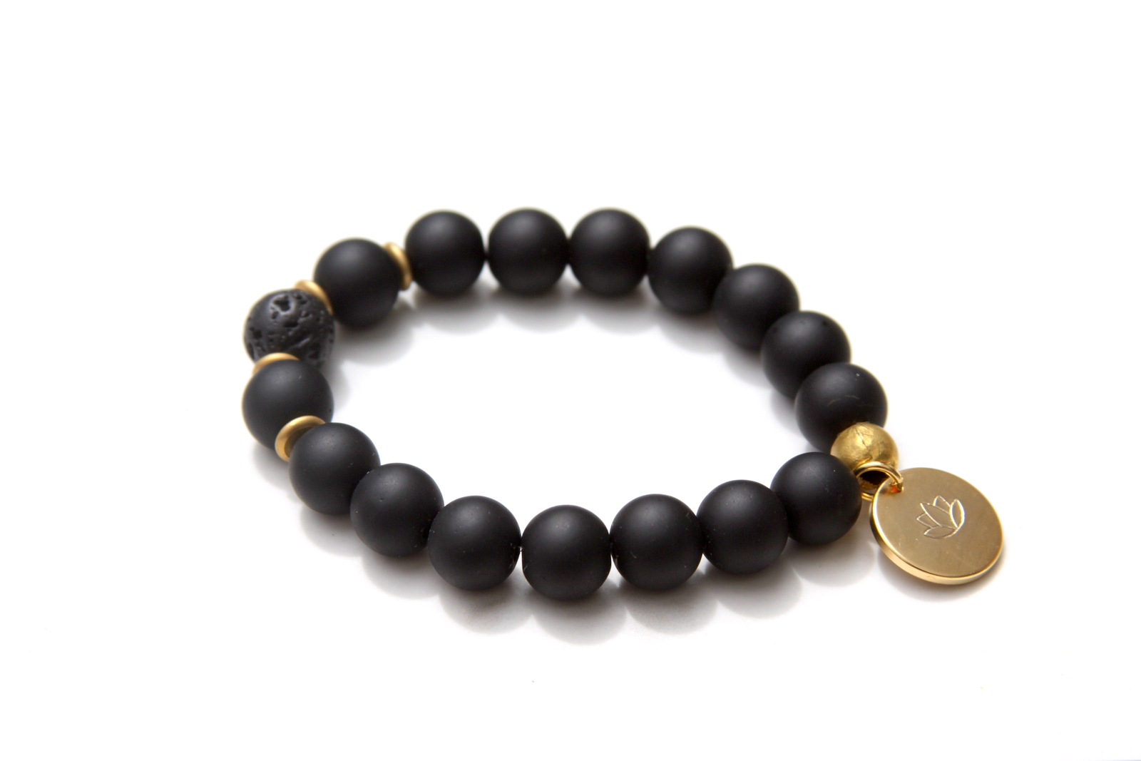 A contemporary take on an essential oil bracelet, wear it without favorite essential oils or without. The matte black onyx beads and lava bead create a combination that is fashionable and perfect to wear with any outfit. Hand stamped lotus flower charm. A great gift for any yoga lover. Black onyx is the stone of protection and getting rid of negative energy while helping to develop mental stamina. Wear this bracelet during times of stress to help you feel more grounded. You can infuse the black lava bead with essential oils and enjoy the benefits of essential oils for mood enhancement. You can read here more about how to use essential oils with the essential oil bracelets.